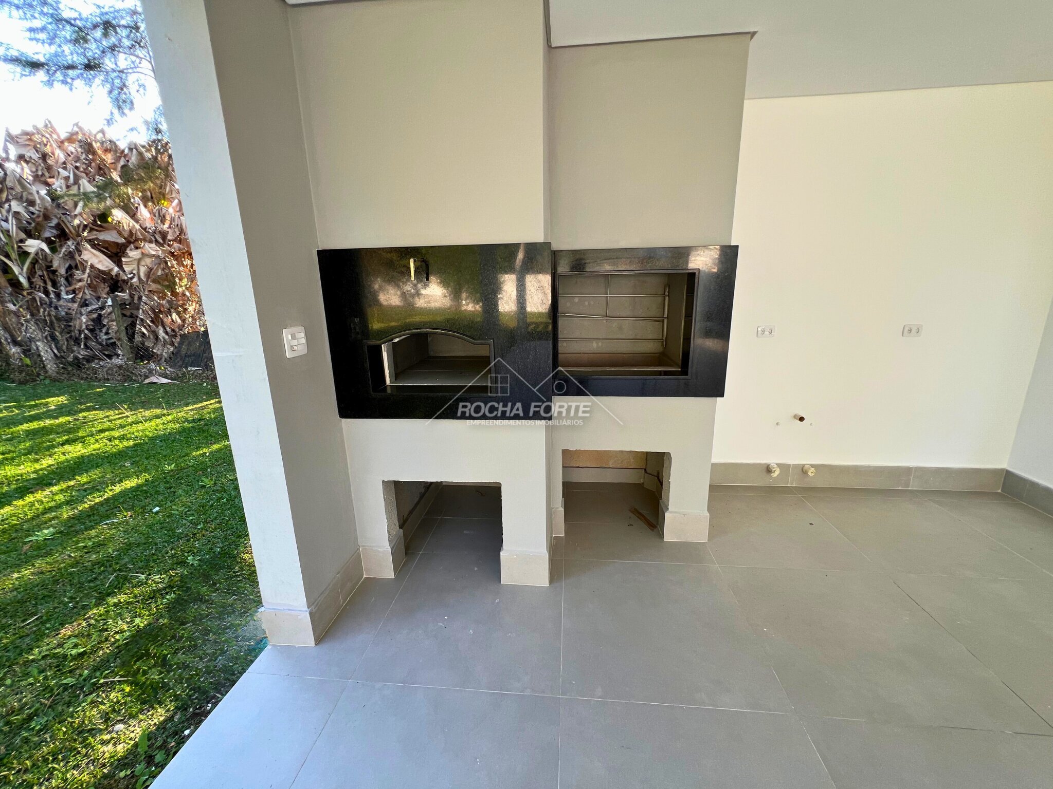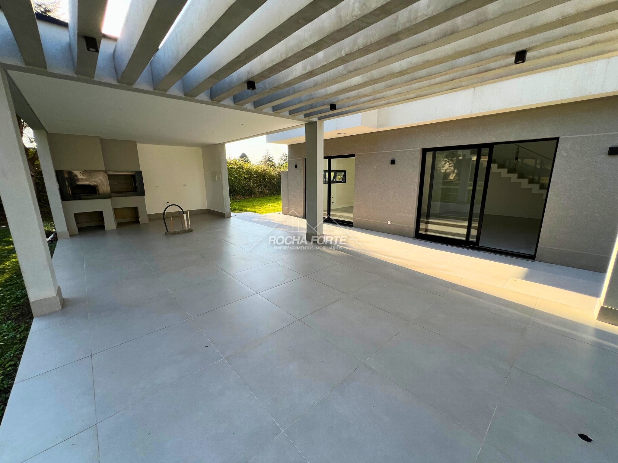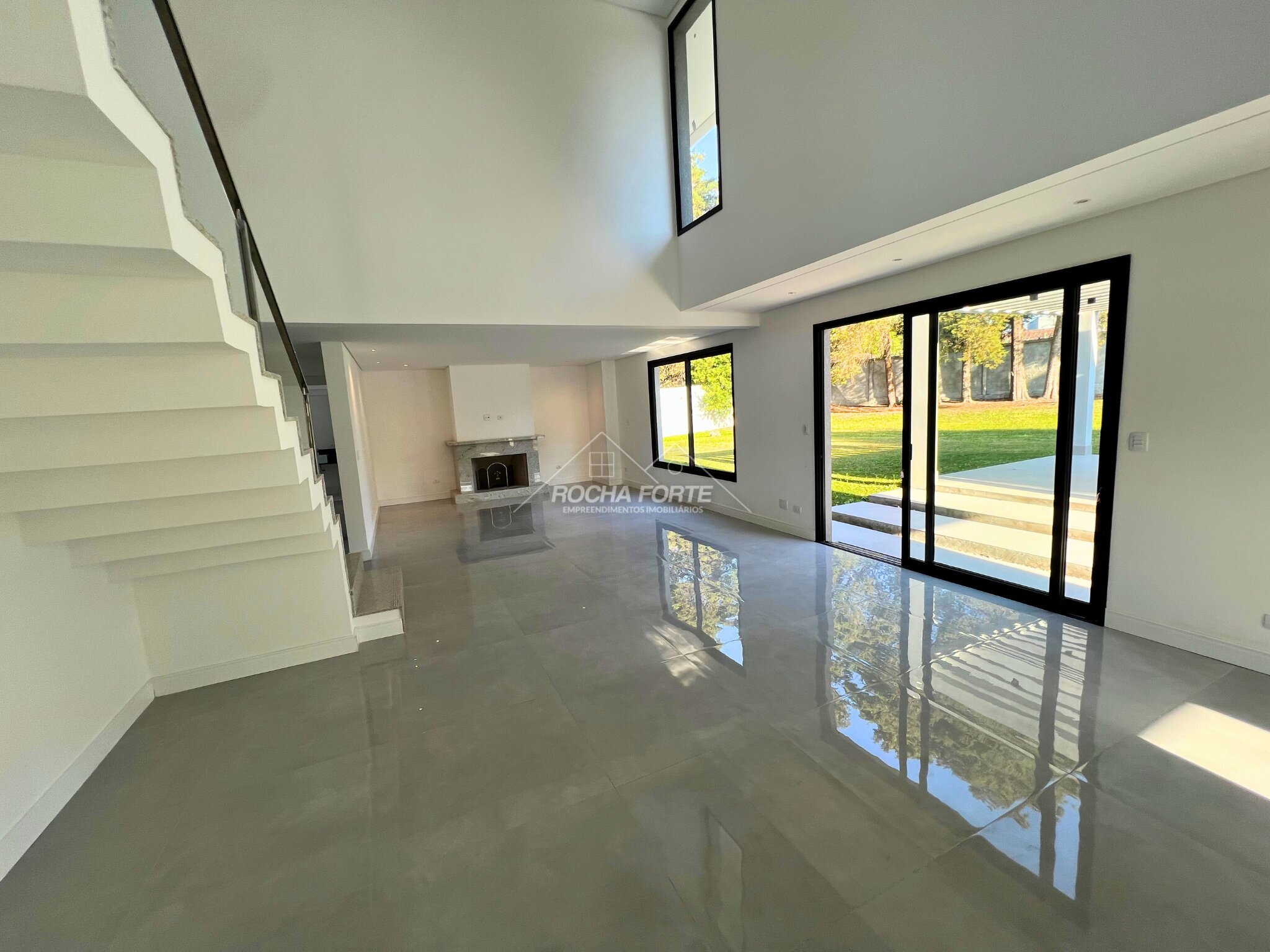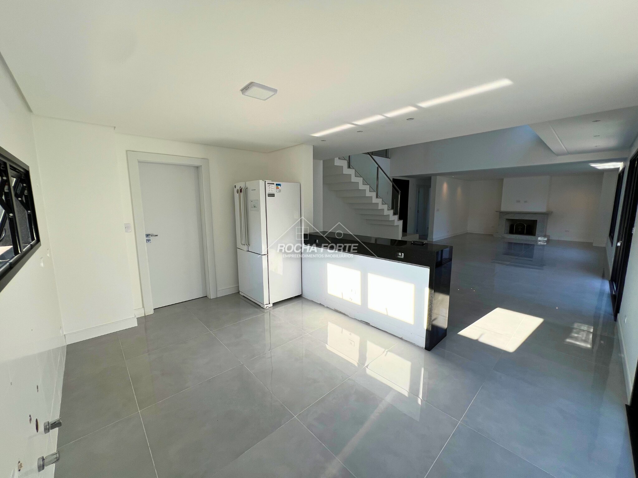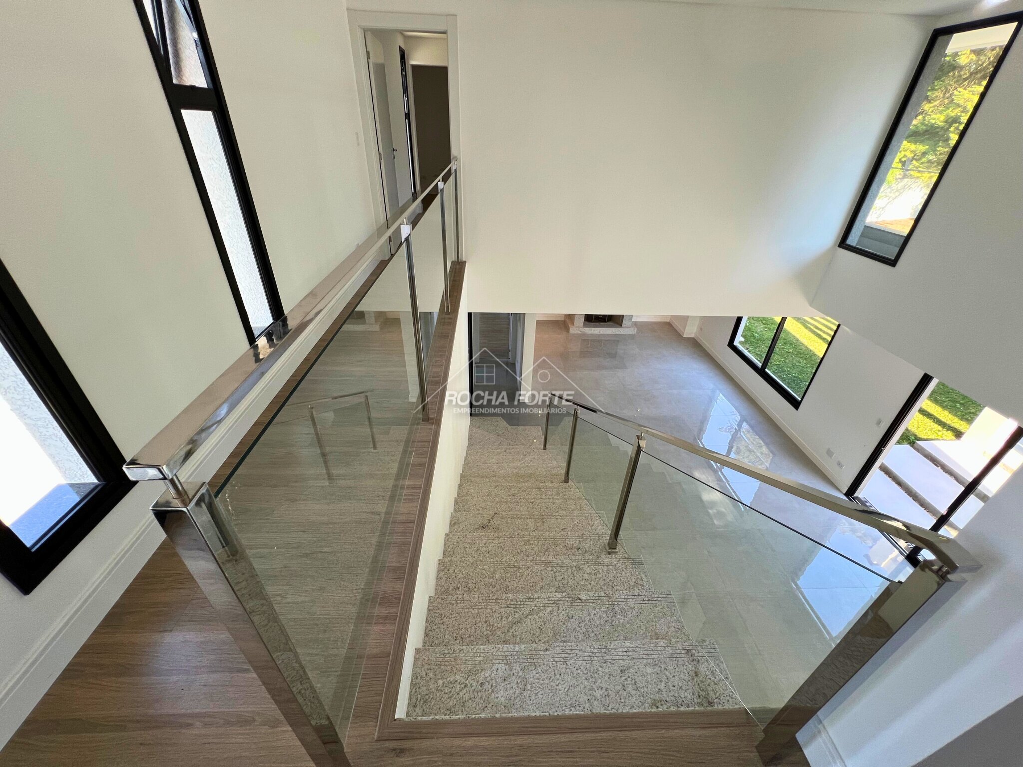 1º pavimento: ampla sala para 3 ambientes com lareira, lavabo, cozinha e lavanderia bem espaçosa com 02 pontos para aquecedor. Conta ainda com uma suíte (que pode ser usada como escritório, inclusive ja tem um acesso independente direto por fora da casa), garagem coberta para até 03 carros + 06 descobertas. No 2º pavimento: São 3 quartos, sendo: 01 suíte com closet e sacada, 01 demi-suíte com sacada e um quarto. Belo terraço descoberto onde pode ser feito um paisagismo. Todos os quartos com persianas automatizadas. Na parte dos fundos, temos um amplo espaço gourmet com churrasqueira e forno de pizza.