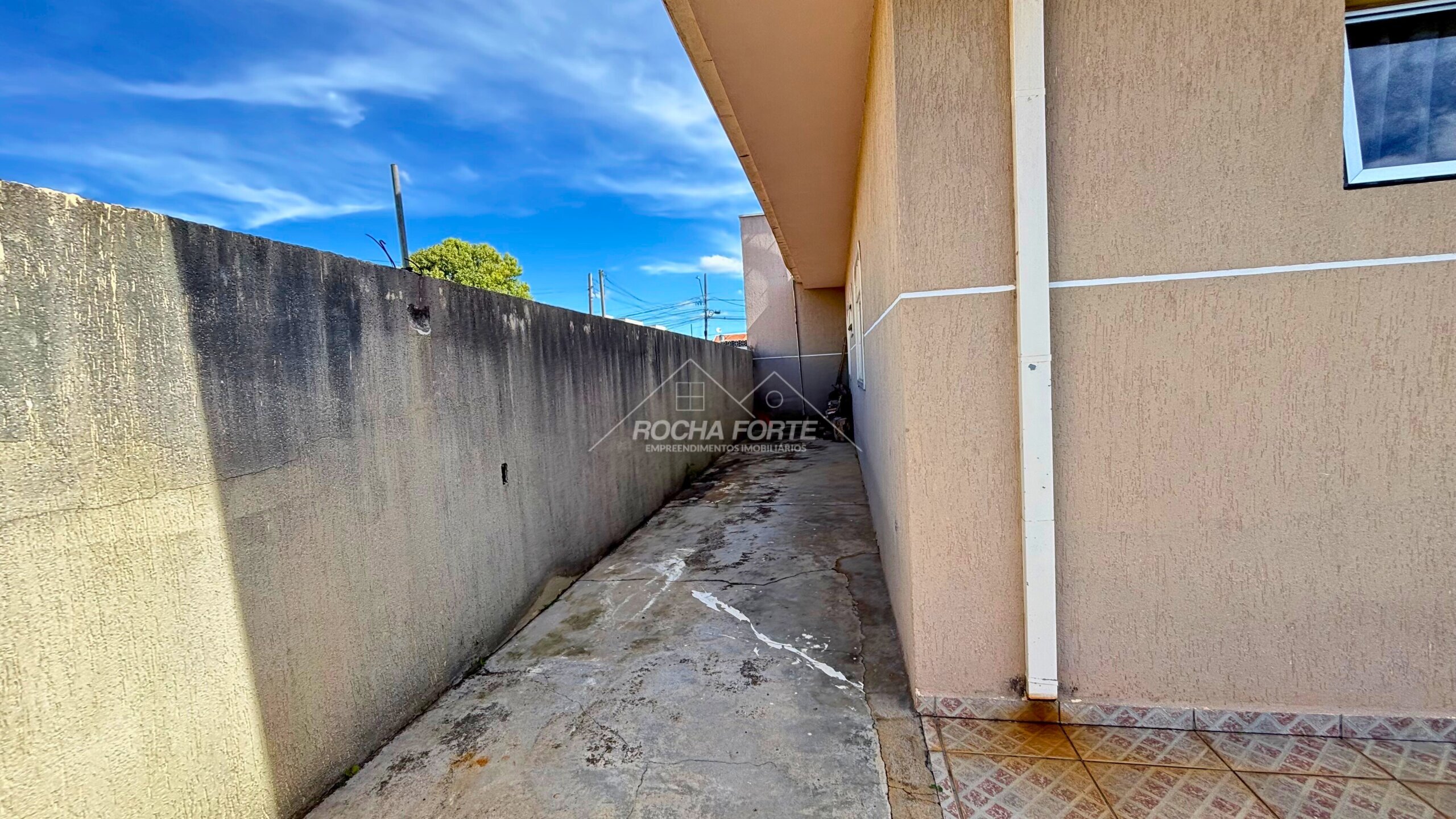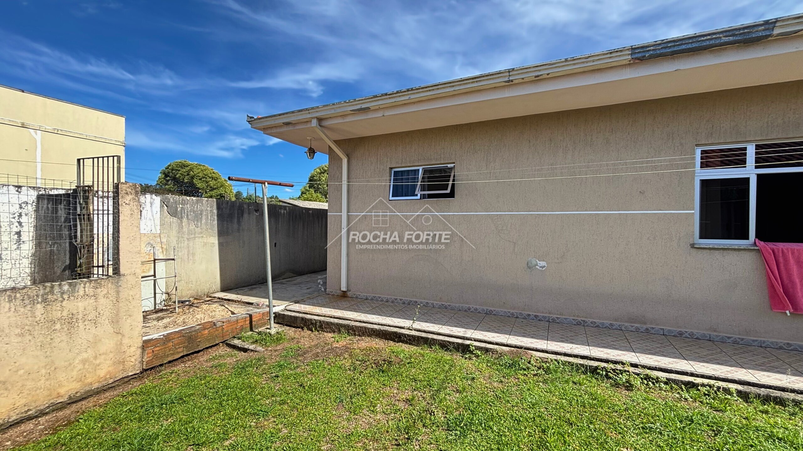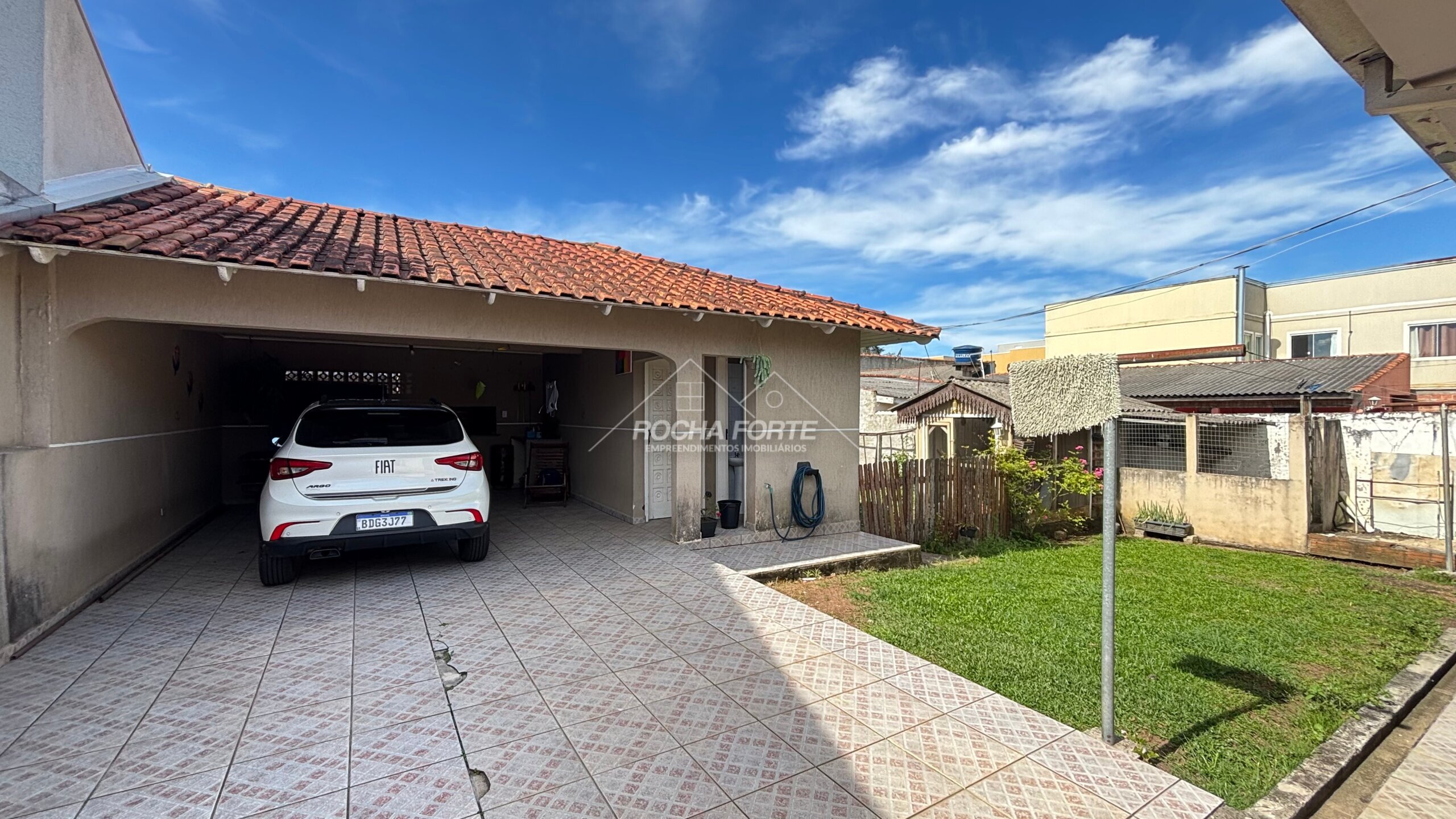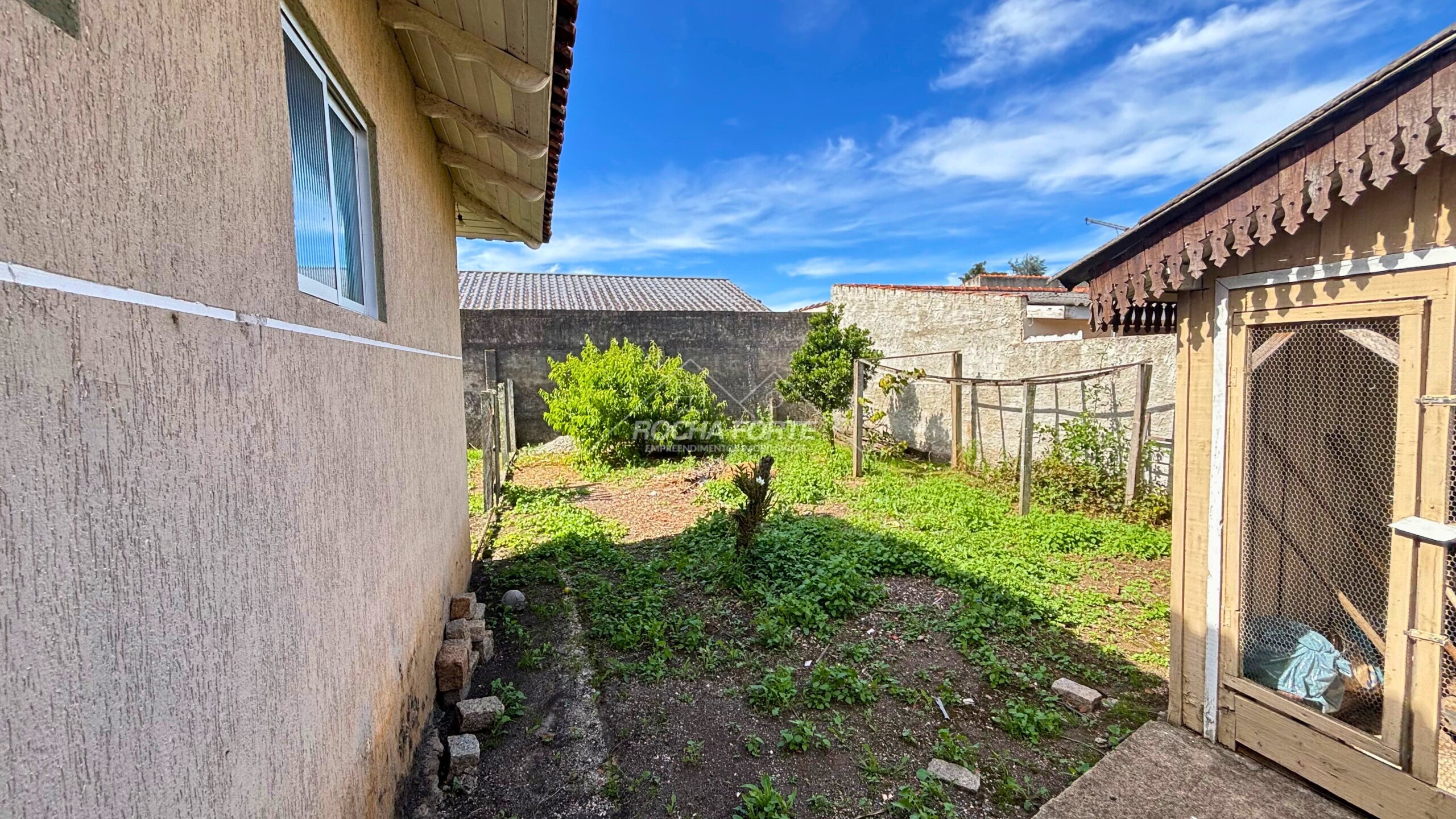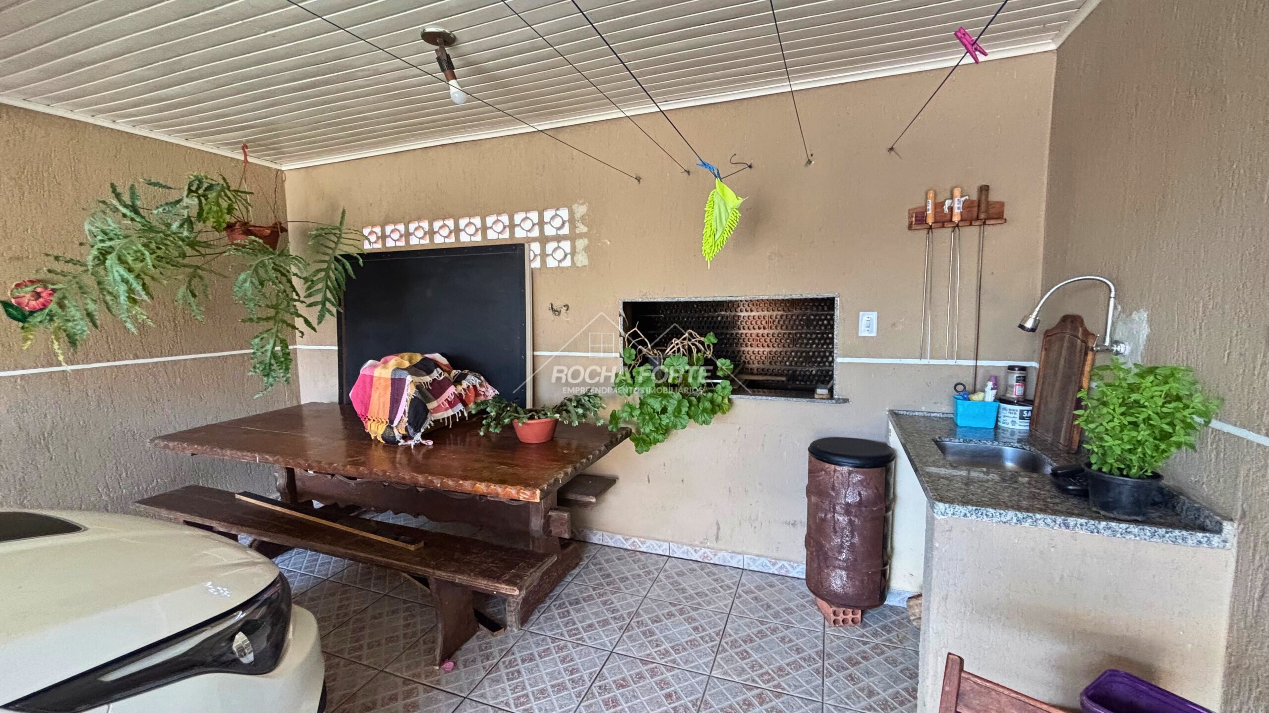 Nos fundos área construída de aproximadamente 50m2, sendo: área de serviço, quarto, banheiro, garagem coberta e churrasqueira.