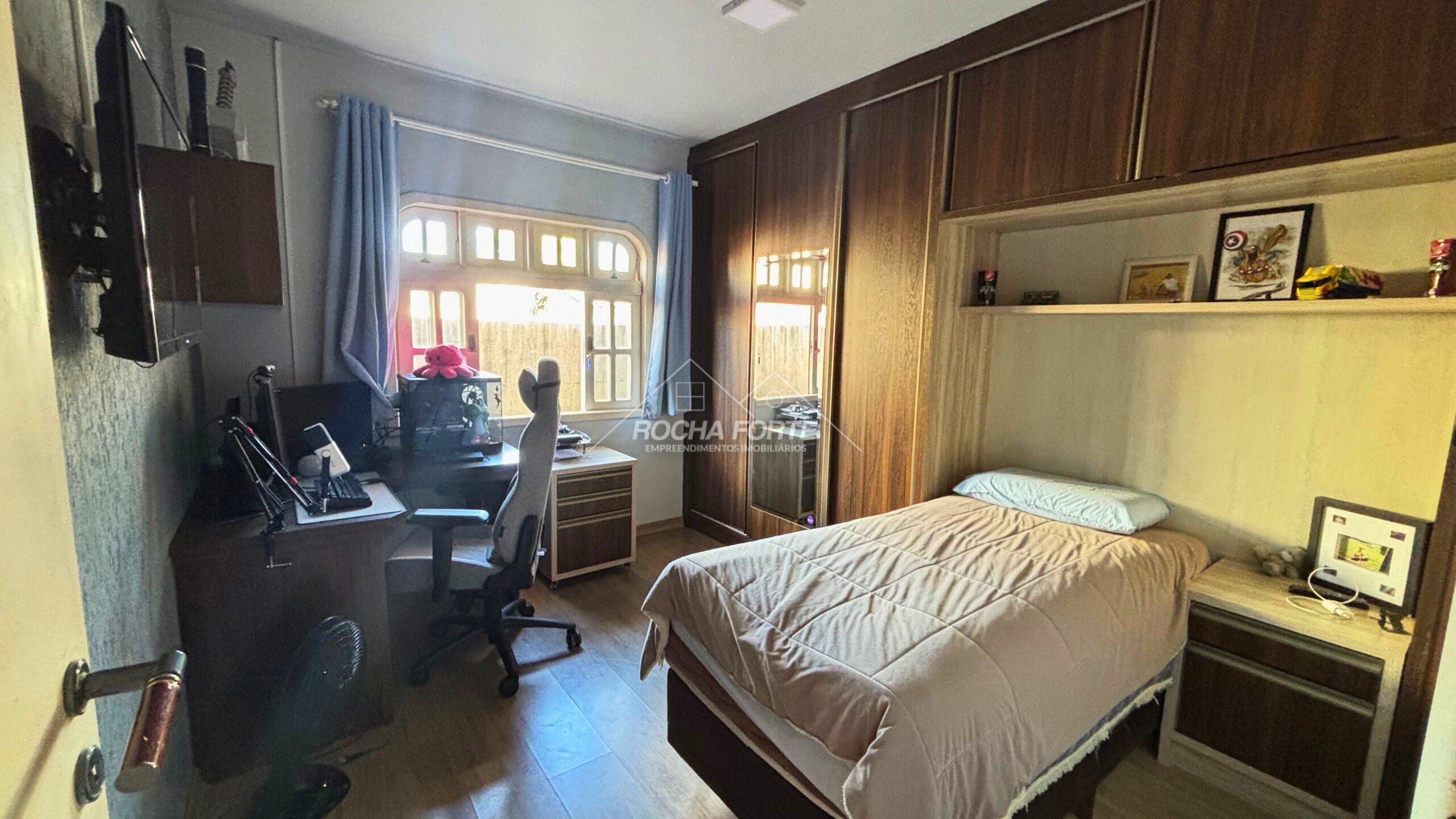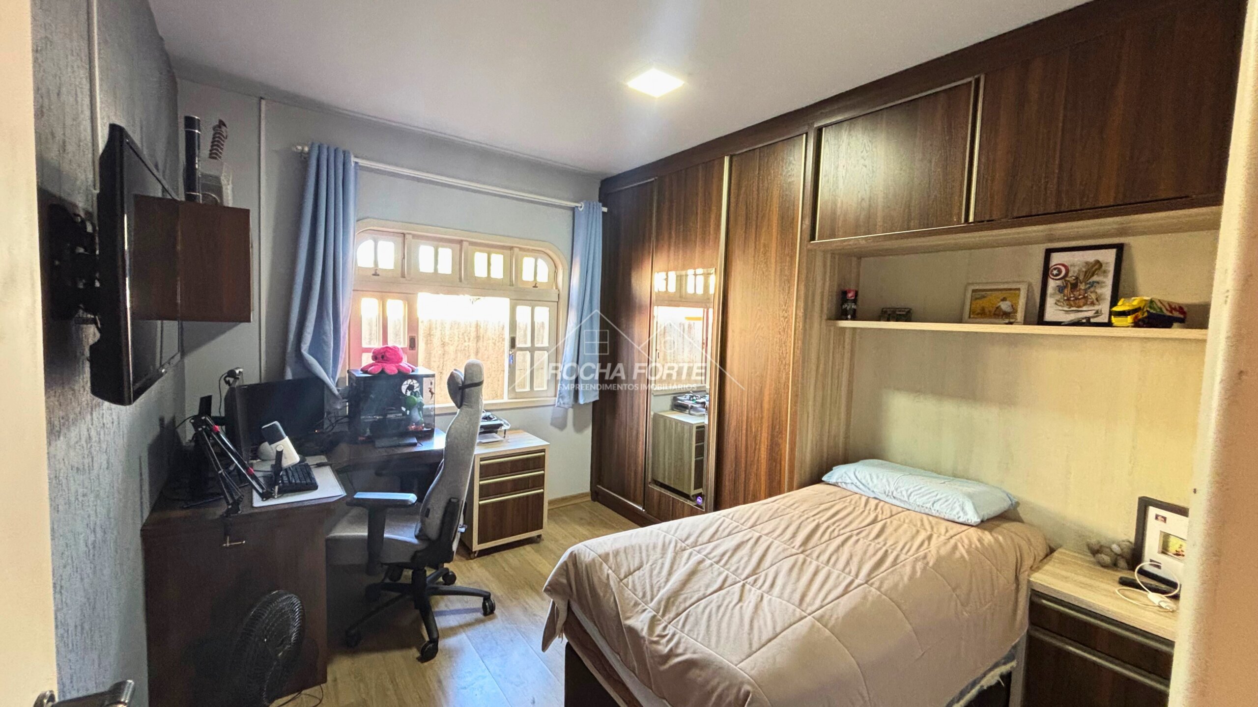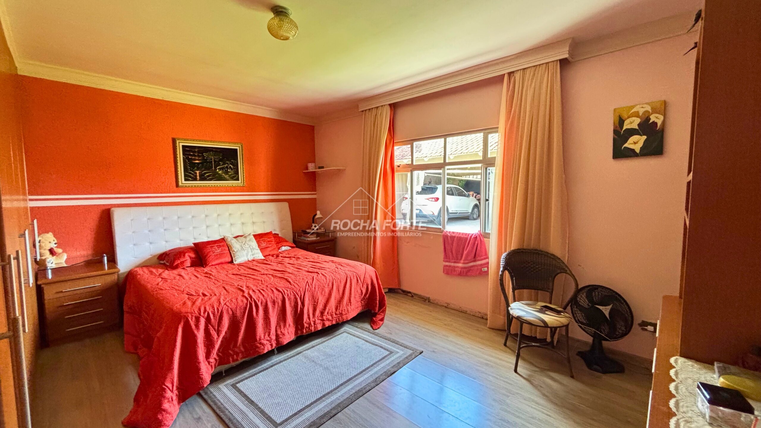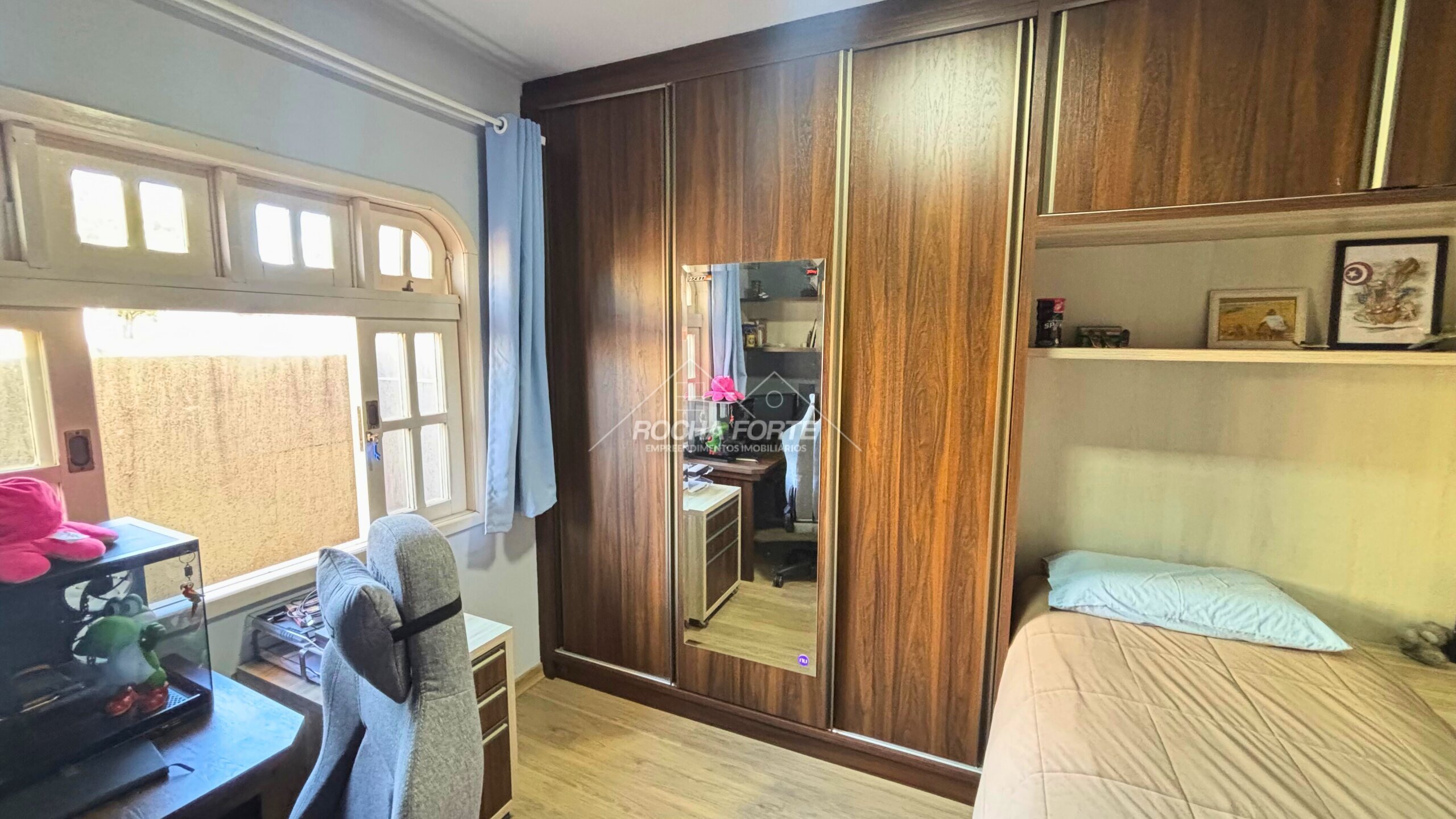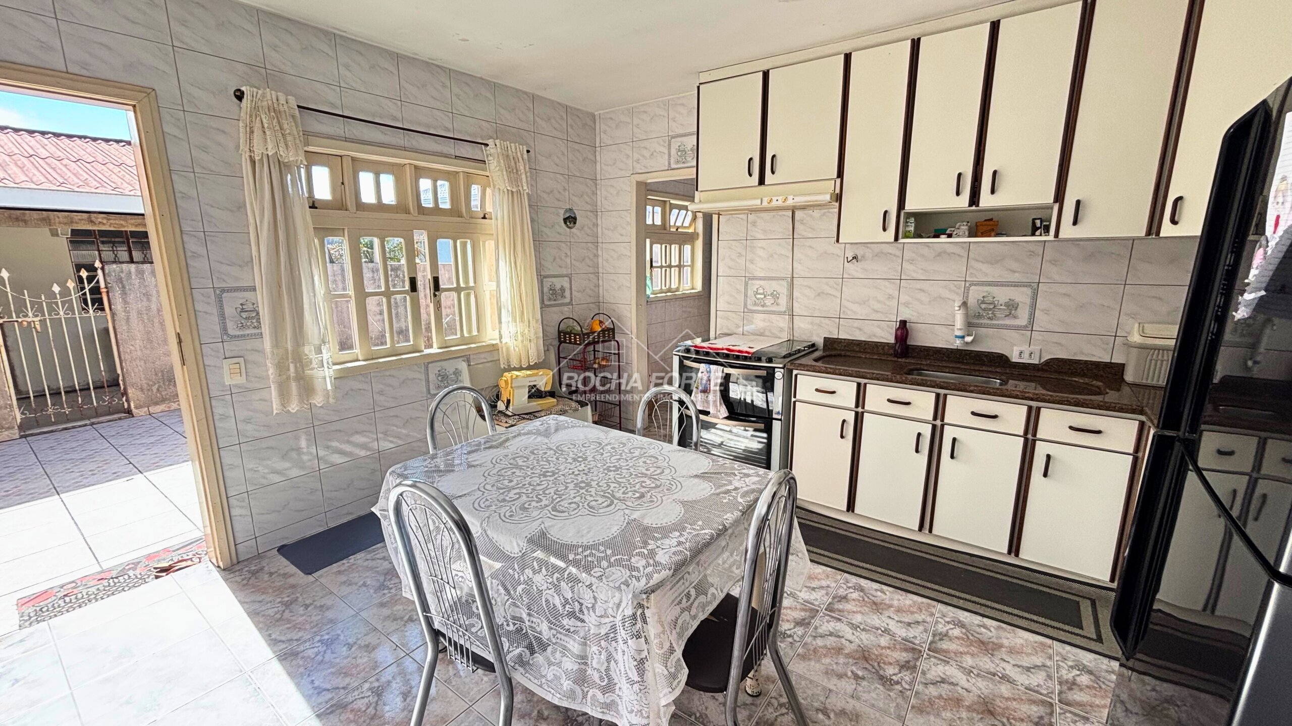 Nos fundos área construída de aproximadamente 50m2, sendo: área de serviço, quarto, banheiro, garagem coberta e churrasqueira.